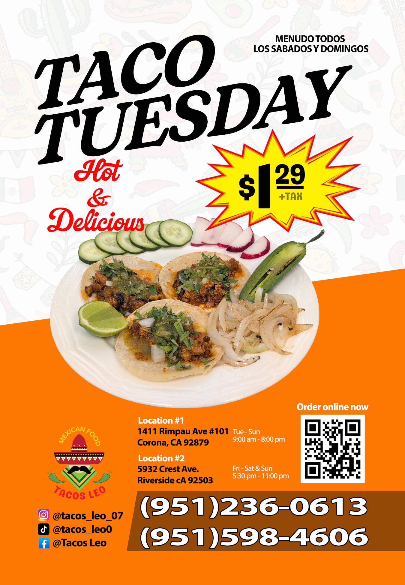 Tostadas Tortas Tacos Plates Quesadillas Pozole Order now ! Follow us on our social media channels Facebook Instagram Tiktok Leo's on Instagram Your browser does not support videos. OUR MENU 🌮 🔍 VIEW FULL MENU Tacos Leo Specialities Prices subject to change without notice